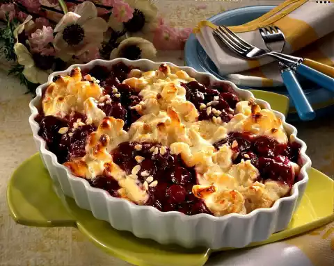 Separate eggs. Mix quark, cream, egg yolk, remaining sugar and vanillin sugar. Beat the egg whites until stiff and carefully fold into the quark mixture. Then carefully mix in the noodles. Place the noodles and compote in a greased, ovenproof dish and sprinkle with almonds. Bake in the preheated oven (electric: 200 °C / gas: level 3) for approx. 30 minutes. Serve immediately