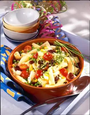 For the vinaigrette, mix stock, vinegar, mustard, salt, pepper and sugar. Whip the oil into the vinaigrette. Mix the pasta, tomatoes, corn, beans, onion and peas and pour the vinaigrette over it. Let the salad steep a little. Wash the chives, dab dry and cut into small rolls. Serve the salad in a bowl sprinkled with chives and garnished