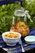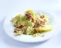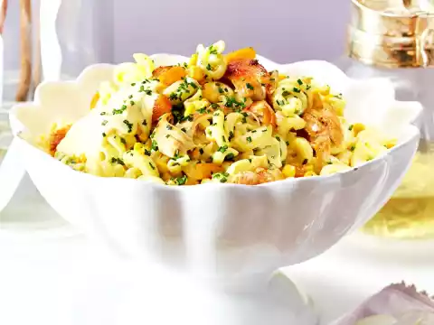 Tear up the meat. Mix the noodles, corn, apricots and chives well, except for 1 tbsp for garnishing. Mix in the sauce well and fold in the meat. Let the salad stand for about 1 hour. Season again with salt, pepper and sugar.