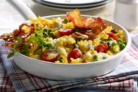 Fry the bacon in a large pan with lid until crispy. Take it out, put the pan aside. Drain the noodles and let them drain. Mix with frozen peas and tomatoes in the pan. Pour egg milk over them. Cover and let it simmer on low heat for about 10 minutes. Spread bacon on the noodles.