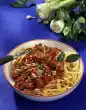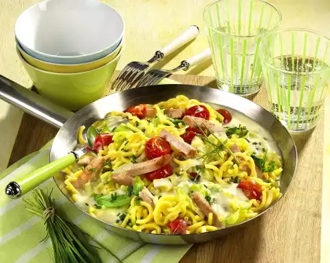 Sauté spring onions, garlic and pointed cabbage in frying fat. Deglaze with stock and cream and bring to the boil. Add pasta and tomatoes and simmer for about 7 minutes in the open pan. Put the meat loaf back into the pan and heat it up. Wash the chives, dab dry and, except for something to garnish, cut into small rolls and sprinkle over the pan. Serve the pan garnished with chives