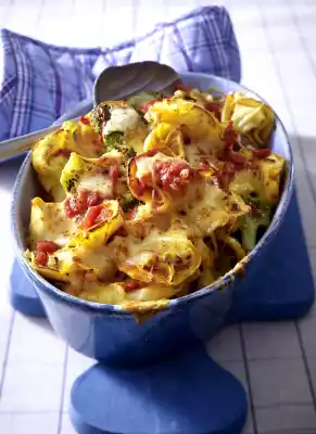 Add the chopped tomatoes, bring to the boil and season with salt, pepper and honey. In the meantime add broccoli florets to the tortelloni in the cooking water for the last 2 minutes and cook along with the tortelloni. Drain the pasta, collecting about 100 ml of pasta water.