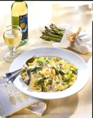 Season the sauce and heat the asparagus in it. Drain the pasta and serve with sauce and chervil