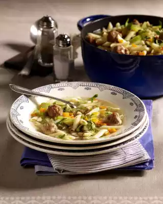 Sauté the vegetables in it. Add stock, bring to the boil, add noodles and simmer for about 10 minutes. Press the sausage meat out of the skin as a dumpling. Heat 1 tablespoon of oil in a pan. Brown the meatballs all around.
