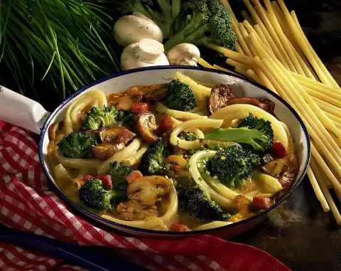 Cook the pasta in plenty of boiling salted water for about 10 minutes. In the meantime, clean and wash the broccoli and cut it into florets. Cook broccoli in boiling salted water for about 10 minutes. Clean and slice the mushrooms. Drain noodles, rinse and drain. Peel and chop onions. Cut ham into cubes.