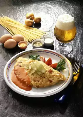 Prepare the tomato sauce according to the instructions on the packet. Arrange omelettes on 4 preheated plates. Place a dollop of tomato sauce on each plate. Garnish with gherkin slices, tomato quarters and parsley.