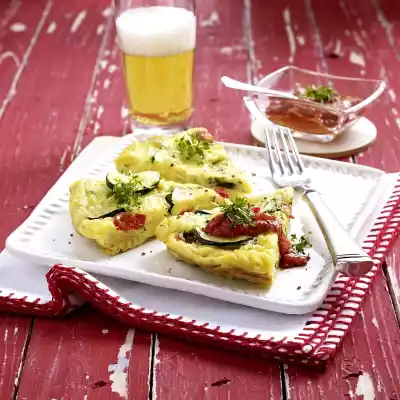 Heat the oil in a coated pan (approx. 24 cm Ø). Fry the zucchini slices for 4-5 minutes while turning. About 2 minutes before the end of the cooking time, add onion rings, garlic, pasta and halved tomatoes. Season with salt and pepper. Pour the egg mixture into the pan on top of the vegetables. Stir gently with a spatula to allow the egg to fry halfway. Sprinkle the rest of the cheese on top and let it set in the preheated oven (electric cooker: 200 °C/ convection oven: 175 °C/ gas: level 3) for 15-20 minutes