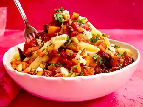 Sweet potatoes peel, wash and cut into small cubes (approx. 0.5 x 0.5 cm). Bring 3-4 l salt water (1 teaspoon salt per litre) to the boil. Roast pine nuts in a large pan without fat and take them out.