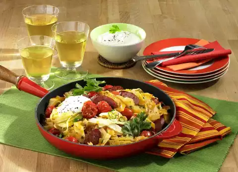 Drain the pasta, let it drain and add to the cabbage. Add cabanossi and tomatoes as well. Season with salt and pepper and simmer for another 5 minutes. Add parsley and fold in.