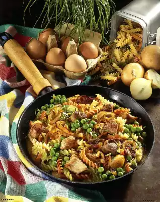 Fry in hot oil, add onion rings and fry for about 5 minutes while turning. Add peas and noodles and fry. Whisk eggs, salt and pepper. Pour into the pan and let it simmer at low heat.