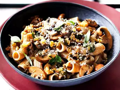 Cook the pasta in salted water according to the instructions on the packet. Clean and slice the mushrooms. Sauté mushrooms, onion and the rest of the garlic in hot butter. Add the rest of the herbs and about 100 ml of pasta water, bring to the boil and season with salt and pepper. Drain the pasta, put it back into the pot and mix in the mushrooms. Sprinkle with crumbs. If you like, sprinkle grated cheese on top.