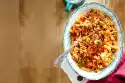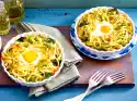 Preheat oven (electric cooker: 180 °C/circulating air: 160 °C/gas: see manufacturer). Line a tray with baking paper. Bring 3-4 l salt water (1 teaspoon salt per litre) to the boil. Peel and finely chop the garlic and onion. Wash herbs, pluck off leaves and chop. Crumble bread, mix with oil and 1⁄3 each garlic and herbs. Spread on the baking tray and bake in the oven for about 10 minutes.