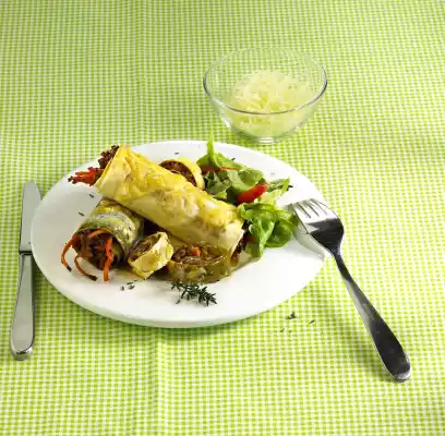 Deglaze with milk and vegetable stock, simmer for about 5 minutes. Season to taste with salt and pepper. Add deep-frozen herbs. Spread the minced meat mixture on one narrow side of each lasagne sheet and roll up.