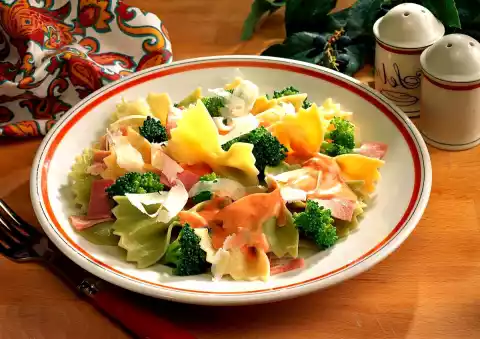 Cook the pasta in a little salted water for about 8 minutes. Steam broccoli in the broth. Remove broccoli from the stock. Stir tomato paste and crème fraîche into the stock. Season to taste with nutmeg. Serve the pasta and broccoli with the sauce and the ham