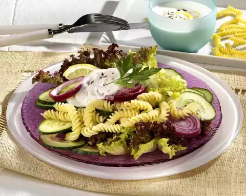 Cook the pasta in plenty of salted water for about 8 minutes, then drain. Peel onions and cut them into fine rings. Wash cucumber, cut into slices. Clean and wash salad, pluck leaves smaller.