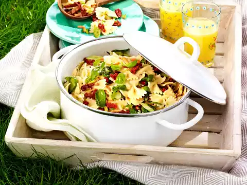 Drain the pasta. Mix the pasta, vinaigrette, spring onions, pine nuts and tomato strips and leave to stand for about 15 minutes, stirring occasionally. Season salad again with salt, pepper and possibly vinegar. Pluck large basil leaves roughly small. Finally fold in basil leaves.