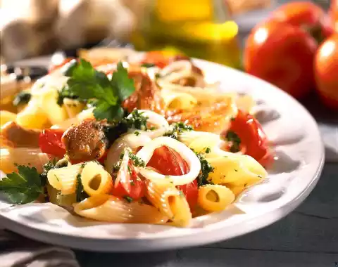 Cook the pasta in boiling salted water for 10-12 minutes. Quench cold and drain. Meanwhile wash the meat, dab dry and cut into pieces. Heat oil in a pan and fry the meat in it for 5-6 minutes at medium heat until golden brown.