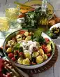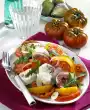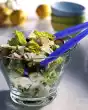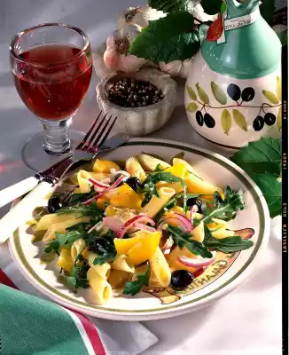 Cook the pasta in boiling salted water for about 12 minutes. Quench cold, drain and allow to cool. Peel onion, cut into rings and halve. Clean, wash and cut the bell peppers into pieces. Clean the rocket, wash and pat dry. Mix noodles, onion, bell pepper, rocket and olives.