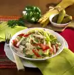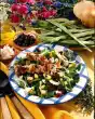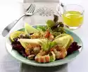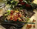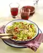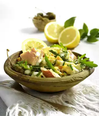 Mix the pasta and sauce. Carefully fold in the rocket, trout pieces and egg. Season to taste with salt and pepper. Garnish with lemon slices and caper apples