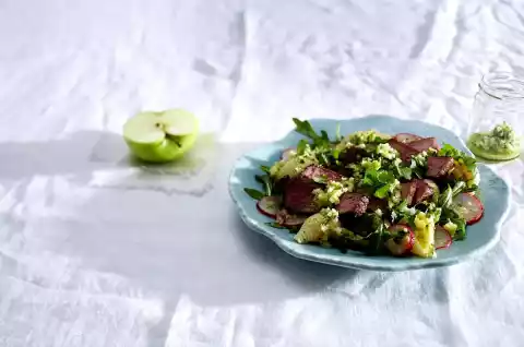 Meanwhile, clean, wash and dry rocket and mix with the noodles. Cut the steaks open. Serve salad with steak strips. Spread the rest of the pesto on top.