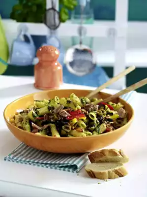 Mix the peppers, olives and tuna with the pasta, let it stand for about 30 minutes. Season to taste once again. Sprinkle pine nuts over it.