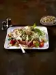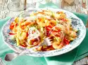 Roast the pine nuts in a pan without fat until golden brown, take them out. Clean and wash the peppers and cut them into thin strips. Drain olives and tuna. Coarsely chop the olives, pluck the tuna.