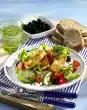 Peel garlic and press it through the garlic press. Stir sour cream and olive oil until smooth, add garlic. Stir in pine nuts and cheese. Season dressing with salt and pepper. Mix pasta, radishes and salad with the dressing and arrange on a plate