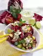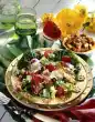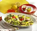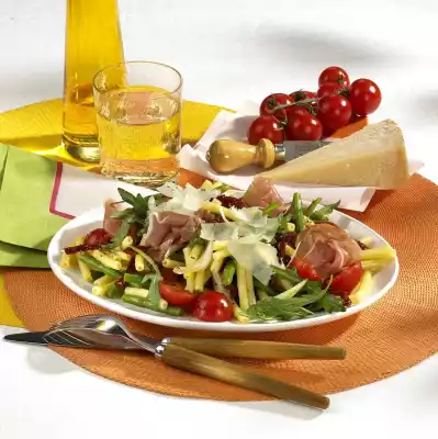 Wash and halve the tomatoes. Drain dried tomatoes and cut into fine strips. Peel onion and cut into thin slices. Mix vinegar, salt and pepper and add oil. Stir in onion slices and mix the vinaigrette with pasta, beans, cherry tomatoes and dried tomatoes. Add half of the sliced Parmesan cheese and leave to soak for about 30 minutes. Clean the rocket, wash and drain well. Halve the ham slices or cut them into wide strips. Season salad with salt and pepper.