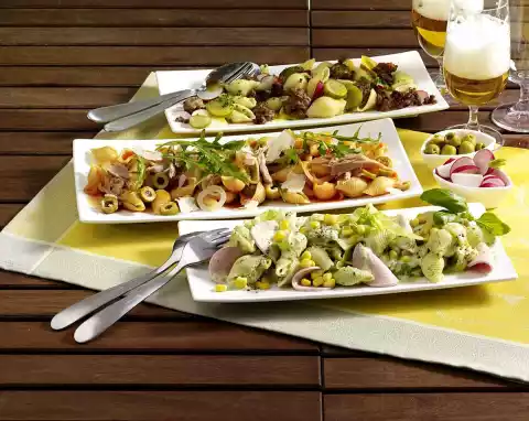 Drain the tuna and pluck it into pieces. Peel onion and cut into rings. Drain the olives and cut into rings. Clean and wash the rocket. Stir ketchup and 1 tablespoon of oil into a third of pasta.