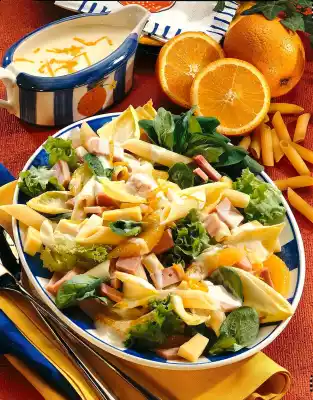 Cut out the fruit fillets between the separating skins, collecting the juice (results in approx. 1/8 litre). Cut ham and cheese into small pieces. Mix the orange juice with yoghurt, salt and sugar.