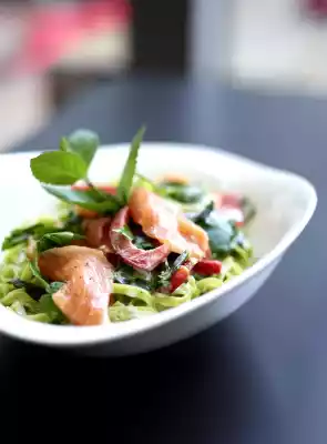 Warm up the sour cream in a wide pot. Add herbs, paprika and salmon and warm up briefly. Season to taste with salt and pepper