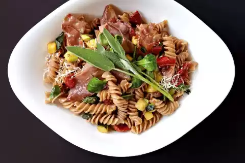 Heat the oil in a wide saucepan. Brown the ham and zucchini in it. Fry sage and tomatoes briefly. Deglaze with Marsala, stir in syrup. Pour in broth, bring to the boil briefly. Remove from heat, stir butter in flakes into the sauce for a light binding.