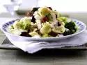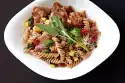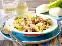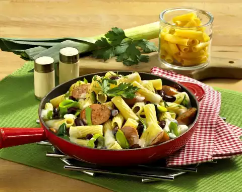 Cook the pasta in boiling salted water according to the instructions on the packet, drain and allow to drain. Clean, wash and cut leek into rings. Cut ham sausage diagonally into thin slices. Put kidney beans in a sieve and drain. Heat oil in a pan and fry the sausage lightly in it. Add the leek and fry for another 3 minutes. Add kidney beans and noodles and fry for about 4 minutes.