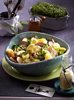 Mix peas, noodles, sausage, radishes and pineapple with the dressing. Cut cress from the bed. Arrange salad in bowls and sprinkle with cress.