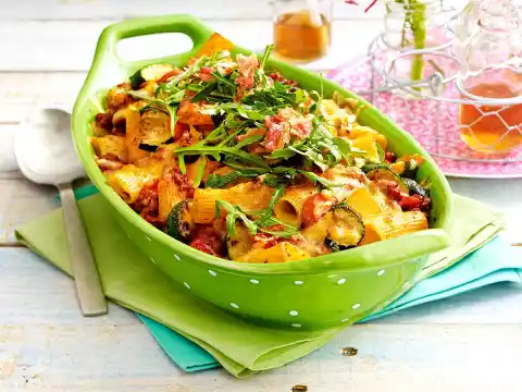 Mix the pasta, vegetables and minced meat sauce and place in a greased casserole dish. Grate both cheeses and sprinkle over them. Bake in a preheated oven (electric cooker: 200 °C/ convection oven: 175 °C/ gas: level 3) for approx. 20 minutes until golden brown