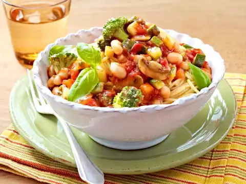 Peel oranges so that the white skin is removed. Cut oranges in half, then cut them crosswise into slices. Add oranges to the vegetable sauce. Season with salt and pepper. Drain the pasta and mix into the sauce.