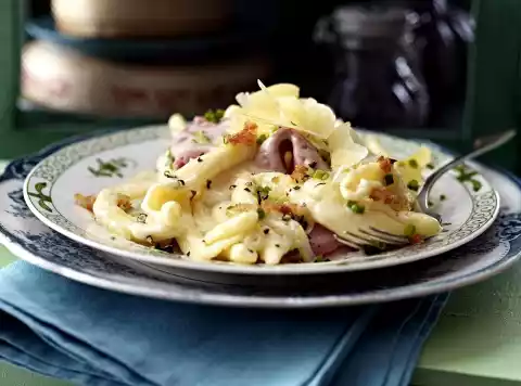 Pick the ham into pieces. Grate Appenzeller. Chop Sbrinz into shavings. Wash the chives, dab dry and cut into small rolls. Peel and chop the onion. Cook the pasta in 3-4 l boiling salted water (approx. 1 tsp. salt per litre) according to the instructions on the packet.