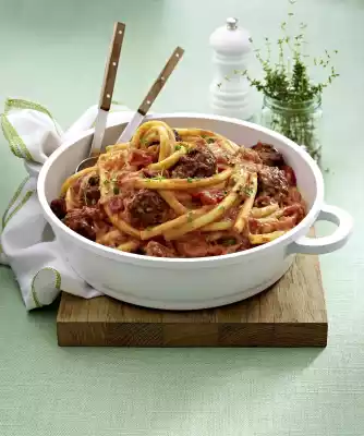 Cook the pasta in boiling water for about 10 minutes until al dente. Stir the ricotta into the sauce. Season to taste with salt, pepper and 1 pinch of sugar. Drain the pasta and mix with the sauce and meatballs. Arrange everything together.