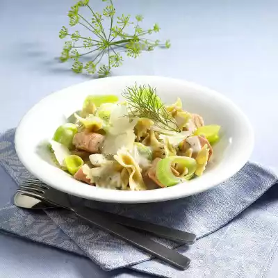 Cook the pasta in boiling salted water according to the instructions on the packet. Wash leek, cut into rings and cook in boiling salted water for 2-3 minutes. Stir flour and cooking cream until smooth. Stir the flour-cream into the stock, bring to the boil while stirring and simmer for 1-2 minutes.