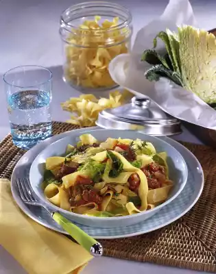 Cut the savoy cabbage into finger-thick strips. Add the celery and savoy cabbage to the Bolognese about 10 minutes before the end of the cooking time and cook in it. Cook the pasta in boiling salted water for about 8 minutes until it is firm to the bite.