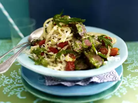 Heat frying fat, fry tomatoes in it, season with salt. Drain the pasta and let it drain. Return to the pot and mix with the cream cheese sauce. Mix in the tomatoes and rocket. Take steaks out of the oven, add pesto and turn steaks in it, cut into strips. Arrange everything, sprinkle with parmesan and serve immediately