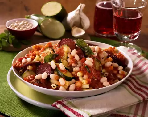 Soak the beans in 1 1/2 litres of water overnight. Bring to the boil with the soaking water and simmer covered for 50-60 minutes. Wash and clean the zucchini, cut them in half lengthwise and slice them. Cut cabanossi into slices. Peel and chop onion and garlic. Wash sage and dab dry.