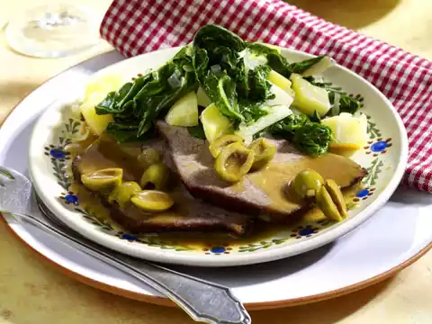 If necessary, stir the starch with 4-5 tablespoons of water until smooth and thicken the sauce. Simmer for 1-2 minutes, then add olives. Season to taste with salt, pepper and lemon juice. Cut the roast into slices.