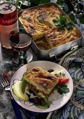 Wash and chop the herbs. Fill half of the noodles into a greased form (25 x 15 cm). Pour minced meat sauce over it and cover with remaining noodles. Sprinkle with chopped herbs and cover with the béchamel.