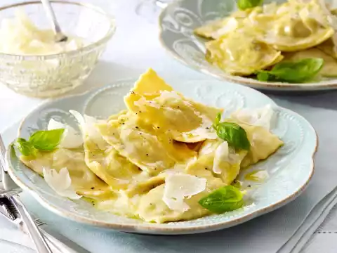 Divide the dough into 6 portions. Roll out with a pasta machine or a rolling pin to make pasta sheets about 1 mm thin. Cut each plate into a long strip of approx. 5 cm wide. Place 1 tsp. of filling on one half of each strip of dough at a distance of approx. 2.5 cm from each other. Brush the dough around the fillings with some water. Whip the free half of the dough over the fillings and press the spaces in between lightly with your fingers. Use a pastry wheel to cut between the fillings. Place on a board, dust with flour and leave to dry in a cool place for about 3 hours