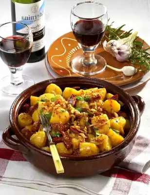 Heat olive oil in a roasting pan. Fry the sausage, onions and garlic thoroughly. Add potatoes and fry briefly. Stir in 1/2 l water and stock and bring to the boil. Cover and simmer at medium heat for about 15 minutes. Cook open for about 10 minutes more.