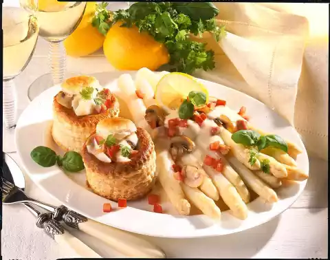 Stir the sauce thickener into the asparagus ragout and bring to the boil again. Wash, clean, quarter, seed and cut the tomato into small cubes. Fill part of the ragout into the pies. Arrange pâté, remaining asparagus and ragout on a plate.