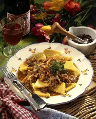 Roll out dough thinly on flour. Cut or cut out lozenges or squares. Cook in plenty of boiling salted water for about 4 minutes, drain. Serve with the meat sauce