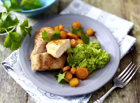 Wash the coriander, shake dry and, except for a little garnish, pluck leaves from the stems and add to the peas. Finely chop the peas with a blender. Season with broth and season with salt and pepper. Keep the puree warm. Wash the meat, dab dry and season with salt and pepper. Heat oil in a pan and fry meat for about 10 minutes, turning. Heat 1 tbsp. butter in a second pan. Stir-fry the carrots for about 4 minutes. Season with salt and sugar. Add 100 ml water and cook the carrots in a closed pot for about 6 minutes. Peel ginger and grate finely.