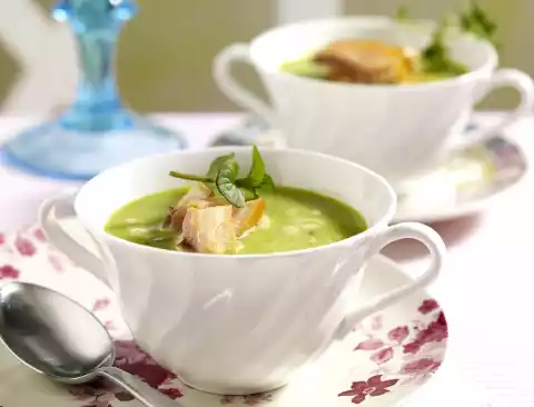 Fill up with broth, bring to the boil and simmer for about 5 minutes. Wash the mint, shake dry and, except for something to garnish, pluck leaves from the stalks. Chop coarsely and add to the soup. Finely puree the soup with a hand blender.
